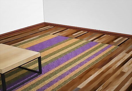 Select a bold patterned rug for an eye-catching way to cover the floor. An area rug is an easy way to brighten a room and add an accent piece at the same time. Try adding a brightly-colored print rug for a pop of color and texture, or choose something more subdued for a subtle accent. For example, you could place a black and red checker print rug in the living room to accentuate the red details in the room. For more color, select a purple and yellow floral print rug for your bedroom to tie in with other floral elements. Go with an animal print rug in your office to maintain a neutral color palette with some extra flair.