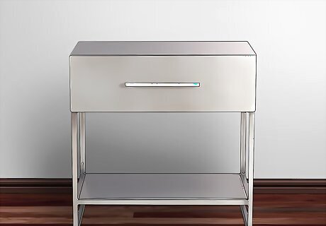 Include shiny metal items to complement gleaming white walls. White walls have a clean, bright look to them, and you can make them stand out even more by adding a few shiny items to the room. Choose furniture, appliances, décor elements, and fixtures that are made from stainless steel, or that have a shiny black, red, or other colored surface. For example, you could get a stainless steel refrigerator in your kitchen, add shiny stainless steel faucets to the bathroom sink, or place a stainless steel nightstand in the bedroom. You can also find furniture with a shiny metal finish, such as gleaming apple red stools for your breakfast bar. For a shiny metal accent piece, get a stainless steel sculpture to place on your dining room table or on a bookshelf. If you’d like a more edgy or industrial look, go for more natural-looking metals such as steel or iron. For example, you could put up a bookshelf with iron piping or brackets.