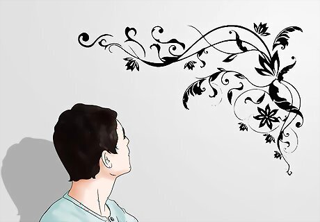 Add text and designs to your white walls with stencils and decals. White walls are the perfect backdrop for a special quote, design, or monogram. You can get stencils and acrylic paint to decorate white walls with the text or design of your choice, or you can choose premade decals to stick the text and designs you want directly onto your walls. Make sure your walls are clean and dry before applying stencils or decals. Use a wet paper towel or washcloth to wipe down the walls. Then, dry the walls with a paper towel or clean, dry towel. Choose a position on the wall where the text and designs will be easily visible and not in the way of anything you want to hang on the wall. Also, don’t place the decals in an area where furniture might cover them. If you have a kitchen with white walls, try putting up a chalkboard decal on one of the walls. You can use it to write grocery lists, menus, or notes. This would also work well in a home office.