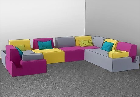 Opt for colorful furniture to make a white room more vibrant. Since white goes with anything, you could also choose furniture in bold colors. Choose furniture in 1 color, in a couple of complementary colors, or in a rainbow of colors! For example, you could place a blue sofa and chairs in a white room. Another option is to place a purple couch and a yellow chair in the same room. For a spectrum of color, choose a red couch, a purple chair, a blue chair, a green coffee table, a yellow lamp, and an orange accent table.