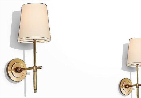 Install wall sconces to shine light on your white walls. You can opt for wall-mounted lighting in a room with white walls, such as sconces. These will help to illuminate white walls even more. Choose sconces that match the rest of your décor, or opt for something that goes well with anything, such as a plain white sconce or a stainless steel sconce. Or, pick a bright color to make the sconces stand out. Try mounting sconces in a hallway with white walls to create a subtle tunnel of light. Place wall sconces above the nightstands in your bedroom for soft lighting while you relax in bed. Add a wall sconce above or below a piece of artwork in your living room to draw even more attention to it. If you don’t want to install new wiring for a wall sconce, you can get sconces that plug into electrical outlets instead. These are a good option if you rent or are decorating on a budget. You can also hang a neon light on the wall that can add a club atmosphere to your room.