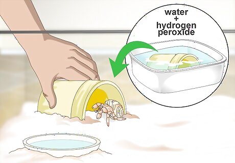 Add a broken ceramic pot. Your hermit crab will need lots of places to hide. One of these hiding spots could be a broken ceramic pot, which you could pick up from a garden center or a pet store. You should disinfect it first with a mixture of two parts dechlorinated water and one part hydrogen peroxide. Since hermit crabs are scavengers, they may hide food between little cracks in your decorations. Be aware that this can cause mold. Sweep through the substrate every few days to check for buried food.