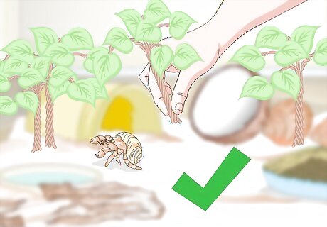 Put in fake plants for a beautiful crabitat. The fake plants designed for reptiles or fish tanks work really well. Pick up some vines, grasses, and ferns. Arrange them around your tank to create a beautiful crabitat. You can get nice fake plants at your local pet store or even at the dollar store.