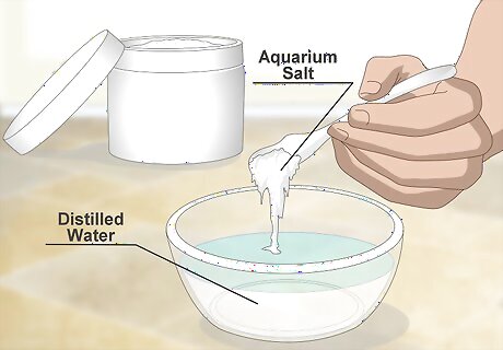 Mix distilled water with aquarium salt. Since tap water contains chlorine and well water has too many minerals, it is best to start with distilled water. Add the recommended amount of aquarium salt to the distilled water. The specific amount should be listed on the package of aquarium salt. If you are dechlorinating tap water, you can add ten dechlorination drops to a gallon of tapwater.