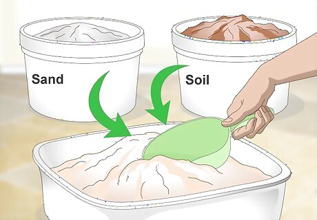 Choose a substrate material. Since hermit crabs molt underground, you’ll need to offer them a suitable substrate. In nature, they tend to prefer substrates that are very moist, with a mixture of coarse sand and soil. You can recreate this experience for your hermit crab by mixing a coarse sand with some coconut fiber. You can also use one of the following substrates: Pre-mixed, hermit crab substrate. An all purpose, pet safe sand from your local hardware store. However, you should double check to make sure it is pet safe, which should be listed on the label. As a last resort, you can use play sand. Since it doesn’t hold moisture well and may contain antibacterial or fungal agents, you should only use it as a last resort. If your backyard soil hasn’t been exposed to contaminants or pesticides, you can go ahead and use it.