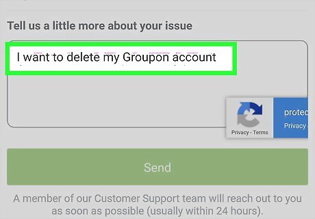 Type I want to delete my Groupon account into the box. It’s the box under the “Tell us a little more about your issue.”