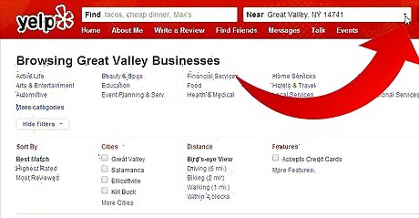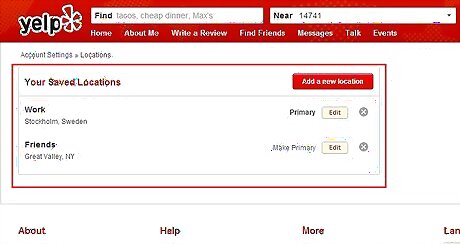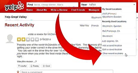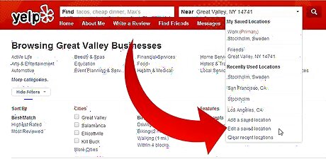 Locate and click the drop-down on the far right-most area of the "Near" box in the search bar at the top of the screen. You'll see a list of things to do, to add search locations along with a list of all your recently-used search locations.
