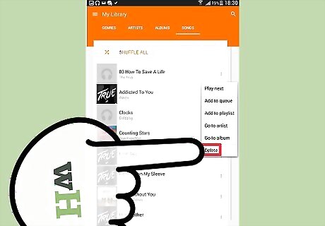 Pick the songs you want to delete. Scroll down the library and look for the track you want to remove. Tap the menu button to the side of the selected track to open its context menu.