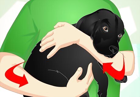 Hold the dog steady. Have your helper place one arm under the dog’s head so its neck rests on the helpers elbow bend. Have the helper put his or her other hand around the dog’s body, holding it steady. If a helper isn’t available have the dog lay down. You will need to hold it steady while applying the medication. Place one arm gently across the neck and under the chin of the dog, and use the hand of that arm to hold the lower front leg. Place the other elbow on top of the dog, pinning its upper front leg to its body.