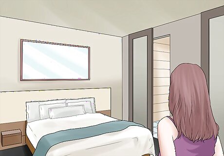 Make the room feel spacious. Depending on the size of the room, this might be hard or easier to do. It will be easier to introduce dead space into a larger room than it will be to do so into a smaller room. Fewer things mean more space. Using mostly light colors in your wall paint, furniture, and textiles will help keep the room feel open and airy. Add mirrors. Mirrors can create the illusion of space and make the room feel larger than it is. A horizontally-oriented mirror over the bed is a good option. Exaggerate small features; for example, install floor to ceiling window treatments to heighten the room. Look carefully at the layout of your motel room to decide what is crucial and what is not. Don’t introduce lots of chairs, tables, floor lamps, potted plants, or other things that take up space. Keep counters and dresser tops clean of excess objects like placards or small statues.