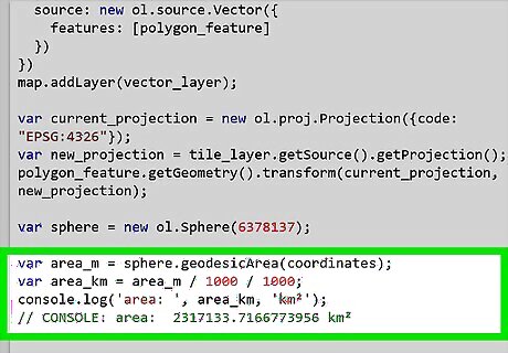 Use the sphere to calculate the area using the geodesicArea() method. Because the method provides a value in square metres, divide by a million to get square kilometres. var area_m = sphere.geodesicArea(coordinates); var area_km = area_m / 1000 / 1000; console.log('area: ', area_km, 'km²'); // CONSOLE: area: 2317133.7166773956 km²