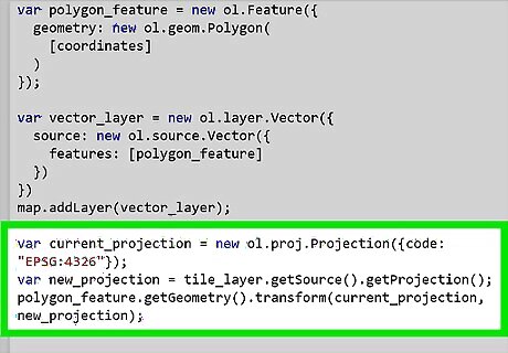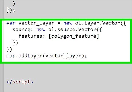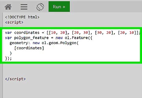 Create a polygon feature. The Polygon constructor function needs an array of coordinate arrays; define this array in a variable first so that you can use it later. Simply copy the following line of code into your element:. var coordinates = [[10, 20], [20, 30], [30, 20], [20, 10]]; var polygon_feature = new ol.Feature({ geometry: new ol.geom.Polygon( [coordinates] ) });