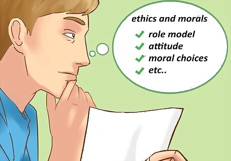 Experiment with your character’s moral qualities. Identify your character's ethics and morals. This will give you a more in depth understanding of your character. Then think of other characters that are similar to the one you are playing. Review movie or TV scenes the character is in and use them as a reference while you rehearse for your character. Ask yourself these questions about your character: “Who do I admire?” “What is my attitude about the choices I make or will have to make?” “Will the pursuit of my goals or needs lead to a moral choice?” “Are the choices that I make based on an ethical standard or not?” “What barriers do I face and how will I overcome them?”