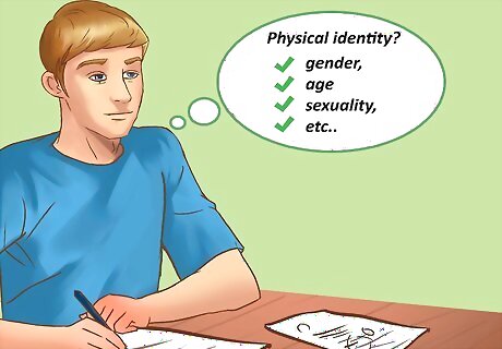 Identify the physical qualities of your character. On a sheet of paper write down your character’s gender, sexuality, age, health status, height, weight, complexion, hair, mannerisms, posture, and type of clothing. When you are rehearsing, use these qualities to create an accurate representation of your character. Ask yourself: “Who am I, what is my name and do I like my name?” “What is my gender and sexual orientation, and how do I feel about them?” “How old am I and what do I think about my age?” “What is my complexion and do I like it?” “Do I have any disfigurements or disabilities, and if I do, how do I feel about them?” “What is the volume, tempo, and pitch of my voice?” “How do I feel about it?” “How does my posture reflect my age, health status, and inner feelings?”
