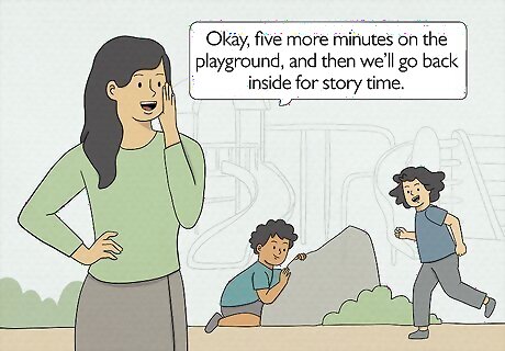 Create routines. When kids know what to expect every day, they’re less likely to misbehave. Establish a predictable schedule in your classroom or daycare. Give the kids a heads-up several minutes before you transition from one activity to the next. For instance, announce, “Okay, five more minutes on the playground, and then we’ll go back inside for story time.” Make sure to balance hands-on activities with quiet activities in your schedule.