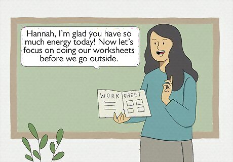 Have positive expectations. Show the kids in your group that you believe in them. Interact with them in a warm, friendly way, and get to know each of them as an individual. Look for the best in them, instead of waiting for a reason to discipline them. If you are a teacher, make every child feel like a valued member of the group by greeting them by name when they enter the classroom. Put a positive spin on things. If one child is frequently boisterous, say something like, “Hannah, I’m glad you have so much energy today! Now let’s focus on doing our worksheets before we go outside.”