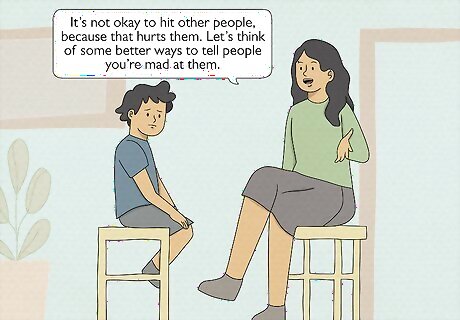 Address the behavior instead of the child’s character. Effective discipline involves teaching, not punishment. Avoid implying that the child is a bad person for misbehaving. Instead, tell them that you know they can do better, and help them think of more appropriate ways to act. For instance, don’t say, “Why are you being such a bad boy?” or “Why can’t you behave?” Instead, say, “It’s not okay to hit other people, because that hurts them. Let’s think of some better ways to tell people you’re mad at them.”