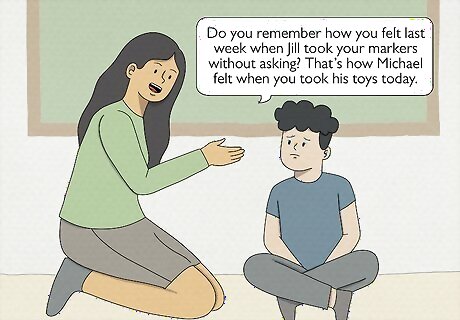 Talk with the child about their behavior. In terms the child can understand, explain why their behavior wasn’t acceptable. Help them understand how their actions affect other people. For instance, you could say something like, “Do you remember how you felt last week when Jill took your markers without asking? That’s how Michael felt when you took his toys today.” Take the child’s age into account as you talk to them. Younger children may need multiple reminders before they understand why certain behaviors are wrong. Talk to the child privately if you can, and discipline them separately away from the group. Don’t lecture them about misbehaving in front of the rest of the group.