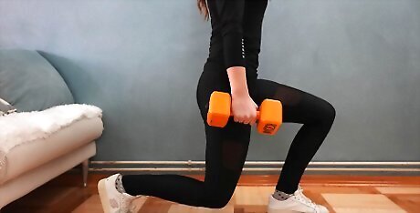 Hold 2 dumbbells to add weight to your lunge. Pick up 2 dumbbells you can comfortably hold. If you’re brand new, maybe stick to the 5–10 lb (2.3–4.5 kg) range. Stand up tall and hold the dumbbells at your side. Step forward into a lunge position and then drive off of your front leg to return to the starting position. Shoot for 8-12 reps on each leg. The extra weight challenges your muscles and balance. Don’t use a weight that’s too heavy for you. Focus on good form and quality reps.