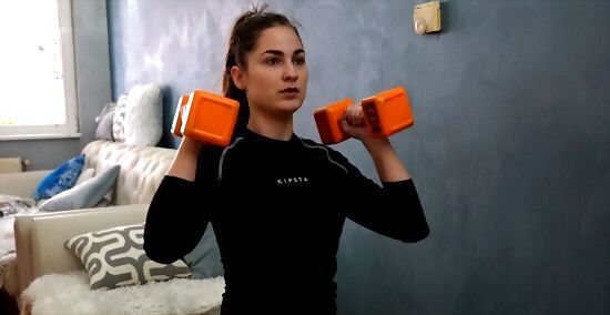 Do bicep curls with dumbbells while you lunge. Work your upper body at the same time as your legs. Grab 2 dumbbells you can comfortably hold. Stand tall and hold them at your sides. Step into a split stance with 1 foot forward and 1 foot back. Sink your hips until your knees form a 90-degree angle. As you lunge, curl the dumbbells up to your shoulder and lower them as you drive off your lead foot to stand and return to the starting position. You can hold 2 dumbbells or try holding 1 to challenge your balance. Make sure you choose a weight you can curl as many times as you can lunge. Aim for 3 sets of 8-12 reps to give your legs and arms a great workout.