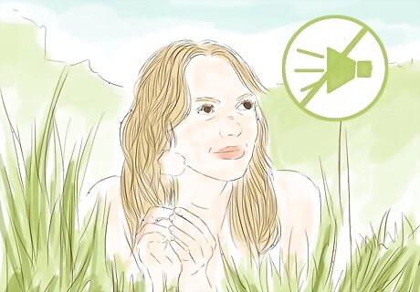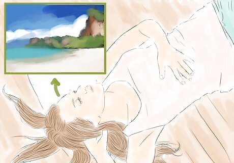 Choose relaxing sensations. You can visualize whatever you want. It can be a real place you've been, or a place that you completely imagine. Try to incorporate as many sensory details as possible to "trick" your brain into thinking you're really there in that moment. Start by picturing a visual image. Choose a place that is totally relaxing. It doesn't matter if you've never been there, just imagine a place of peace and tranquility. Imagine the sounds you'd hear there. For example, if your visual image was a quiet beach, you might imagine the sound of waves slowly lapping or surging against the shore. Next, imagine the physical sensations you might experience there. If you're on a beach, you might imagine the sun warming your skin and the gritty feeling of sand underneath you. Try to incorporate an olfactory sense, if you can. On the beach, for example, you might smell the ocean's salty water wafting in on the breeze, or perhaps the smell of sun screen on your body.