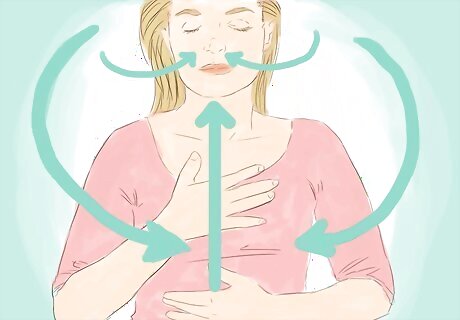Take deep breaths into your abdomen. Deep breathing is as simple as taking slow, deep, long inhalations and slow, extended exhalations. You can do it for as long or as short as you need to. Any time your mind wanders back to something stressful, simply focus on your breath. Inhale slowly through your nostrils. Feel your breath travel down into your abdomen to your diaphragm (just below the ribs). Focus on the sensations of breathing deeply, in and out. You should be able to feel your belly rise and fall on each breath with your hand. If you don't feel your breath, you may need to take slower, deeper breaths.