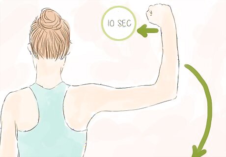Tense and hold your muscles in sequence. Go through the list of muscle groups in sequence. As you work through each muscle group, tense the muscles for about five seconds each, then let go and let the muscles relax for about 10 seconds. Start by making a fist with your right hand and tensing your forearm. Lift your right forearm to tense your upper arm, as though you were flexing your muscles. Repeat these steps for the left hand/arm. Tense your forehead by lifting your eyebrows as high as they can go. Squeeze your eyes closed tightly. Open your mouth as wide as you can to flex your facial muscles. Lift your shoulders up towards your ears. Then push them back, trying to touch your shoulder blades together. Tense your stomach muscles. Then move to your hips and buttocks, squeezing your muscles together. Tighten the muscles in your right thigh, then (slowly) stretch your calf muscle while curling your toes at a downward angle. Repeat for your left leg/foot.
