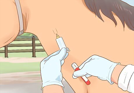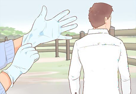 Wear long-sleeved clothing, closed-toe shoes, and gloves. This will help you avoid injury and contamination as you take the horse’s blood. You want to protect yourself from the needle. It’s a good idea to also wear protective eyewear, but this isn’t necessary.Variation: If you don’t want to wear gloves, wash your hands with soap and warm water before taking the blood draw.