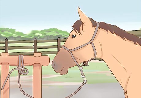 Tie up your horse. Put your horse into its stall or take it somewhere it's comfortable, such as where you groom it. Then, use a halter and a rope to keep your horse in place. You can also ask a partner to help you keep the horse calm and under control.