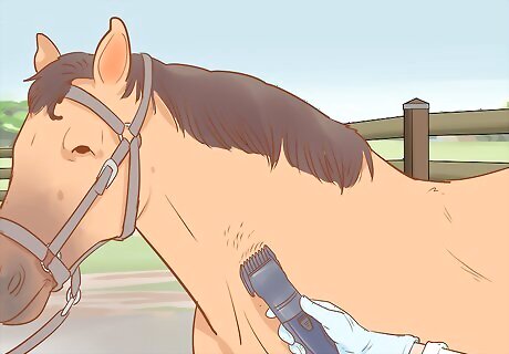 Trim the hair on your horse’s neck if necessary. Use clippers to cut the horse’s coat short over the site of the blood draw. This will make it easier for you to clean the site and see the vein to insert the needle. This step is optional, but it can be helpful. You don’t need to remove a large amount of hair. A square that is 3 by 3 inches (7.6 by 7.6 cm) should be sufficient. You may not need to trim the hair if it’s already very short.