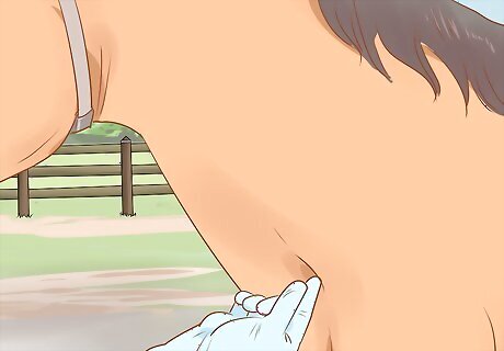 Tap lightly on the middle of the jugular vein to make it easier to see. Use your first 3 fingers to firmly tap the vein about halfway up the horse’s neck. Watch for the vein to bulge slightly, which will make it easier to insert your needle. Make sure you keep your non-dominant hand against the lower part of the neck while you do this. The pressure on the lower part of the neck will reduce blood flow, which makes the vein bulge above your hand so that you can see it more easily.