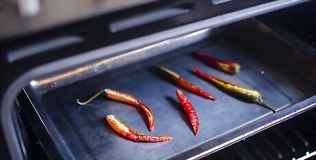 Rotate the peppers once per hour to make sure that all sides of the pepper are thoroughly dried. You can tell that a pepper is dry once it looks thin and leathery. Keep the peppers in a tightly sealed container for storage. Depending on the oven, this process can take anywhere from a few hours to several days. Only use this method if you will be home for an extended period of time.