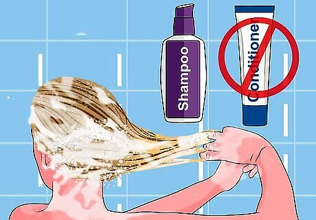 Remove yellow or orange tones with a blue or purple shampoo. After bleaching, wash your hair with a blue- or purple-toned shampoo. Look for a shampoo designed to work safely with bleached or color-treated hair, and follow the directions on the bottle carefully. Make sure to rinse the shampoo out thoroughly to avoid staining your hair blue or purple. Don’t use the shampoo too frequently, as it can dry out or discolor your hair. Try using it once a week to brighten up your hair and minimize yellow, orange or brassy tones.