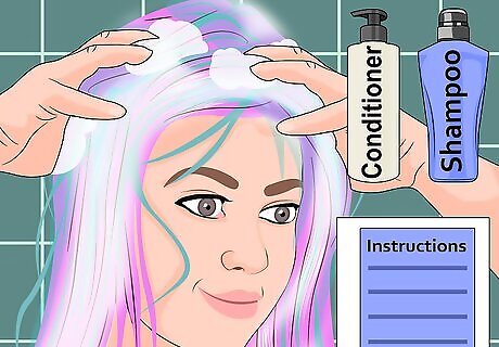 Remove the color. Let it sit as long as the product instructions advise. Then rinse the color out of your hair. You can use shampoo to thoroughly cleanse your hair, and follow up with conditioner. Make sure to use shampoo and conditioner that are safe for color-treated hair.