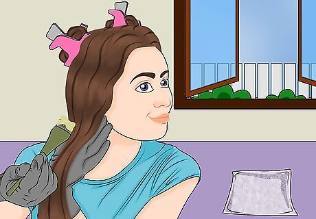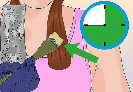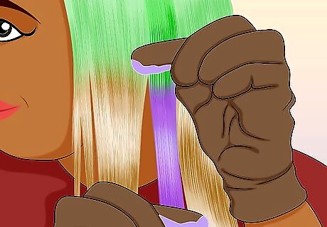 Paint sections of hair. Take down sections of hair over a sheet of foil, beginning with the bottom sections. Paint lightening mixture onto the hair with a brush, starting from the middle of each section and going to the ends. Leave the roots until you have covered the mid-strands to ends. Make sure to thoroughly saturate the hair with the brush, using multiple strokes in various directions as needed. Roll each section up into the sheet of foil after you paint it. Once finished, leave the mixture in your hair for up to 45 minutes, until your hair reaches a yellow stage. You may want to keep your darker roots and apply the opal effect to only the ends of your hair. If so, leave a few inches or centimeters of hair close to your scalp (or however much you prefer) untouched with each section you paint. Make sure to wear gloves and follow all safety precautions that came with your lightening kit. Check your hair with gloved hands every 5 to 10 minutes. Never leave bleach on your hair for longer than 45 minutes. Fine hair lightens more easily than coarse hair. Thus fine hair will process faster than coarse hair.