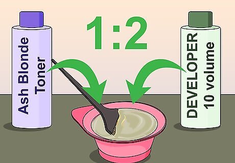 Mix the base color. The goal is to achieve a silver blonde hue. Combine an ash blonde toner with 10 volume developer in a bowl. Use a 1:2 ratio. Stir it well with a brush.