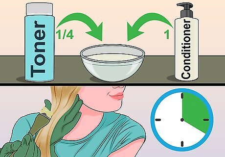Use a blue-based toner to neutralize stubborn orange hues. Combine an ashy toner with a purple- or silver-based shampoo and conditioner. Mix 1 part conditioner to 1/4 part toner or semi-permanent hair dye. Apply it with a brush and let it sit for 15 to 20 minutes before rinsing it out. Condition your hair and wait at least a week before lightening your hair with bleach again. When you reapply the bleach, leave it in until your hair becomes yellow (about 20 to 30 minutes). Then rinse it out completely right away.