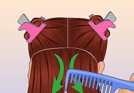 Comb and section your hair. First use a wide-tooth comb, and make sure your locks are completely tangle-free. Part hair into 4 equal sections with a fine-tooth comb. Do this by parting your hair straight down the middle of your head from front to back, and then again across your head from one ear to the other. Twist the top 2 sections up completely, and secure them with plastic clips. Part the back 2 sections down the middle. If you’re having trouble parting or sectioning your hair in the back, stand in front of a large mirror. Hold a smaller mirror in front of you above your head with one hand, and use your comb with the other. Never use metal clips when bleaching or dyeing your hair, as the metal can react with the bleach or other chemicals in the dye and damage your hair.