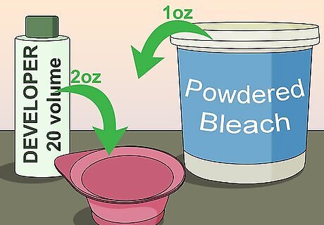 Mix powdered bleach with developer. Use 1 ounce (28.3 g) of powder bleach for every 2 ounces (56.7 g) of developer. You can find these products online or at local beauty supply stores. A lightener is necessary to lift your hair to a pale shade of blonde. Use a 20 volume developer. Don’t use 30 or 40 volume developers at home. Bleach powder and volume developer typically come together in kits. If your hair is thick or longer than your shoulders, you’ll need 2 kits. Bleach kits usually come with 35 or 40 volume developer so be very careful when buying bleaching kits and using higher volume developer as it is much more damaging to your hair! If you’ve never lightened your hair with bleach before, it’s best to go to a professional to get it done. Bleaching can damage your hair and/or scalp, and should be used very carefully.