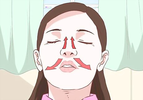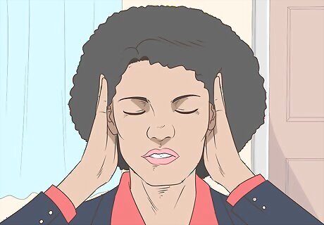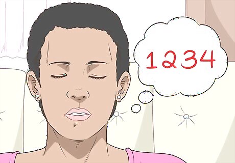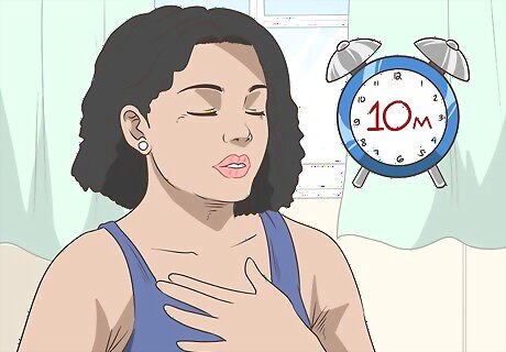 Take deep, deliberate breaths. After you have focused your attention on your breaths and how the air is entering and exiting your lungs, you can breathe with intention. Take a slow inhale as you count to four. Hold for a count of four, then release as you count to four. You can do this discreetly as you talk to others or participate in a group gathering. You can subtly inhale and exhale, and count to yourself. Repeat this three times. If you need to continue, keep breathing until you feel more in control. You may also count to ten as you breathe. Count each breath as one count. If you start to focus on something other than your breath, start over at one. This is okay and normal. Try breathing in through your nose, paying attention to the way the air feels as it fills your belly and chest. Then, deliberately relax your tongue as you exhale through your mouth. That can trigger the parasympathetic part of your nervous system, which is responsible for rest and digestion. Other types of breathing you might try include belly breathing and alternate nostril breathing.