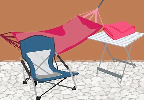 Pack the proper gear. You will definitely enjoy your camping experience more if you have everything you need to make your stay comfortable. Bring camp chairs, folding tables, and hammocks so you’re not stuck sitting on the ground. Extra blankets are good for wrapping up while around the campfire. Most camping problems are easily solved if you bring along tools and hardware like a hammer or axe, rope, matches, pocket knives, lanterns, and flashlights. Other items that will help ensure your comfort and pleasure while camping include fire wood, toilet paper, paper towels, hand sanitizer, extra batteries, shower shoes and towels for bathing, and rain gear/umbrella.