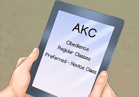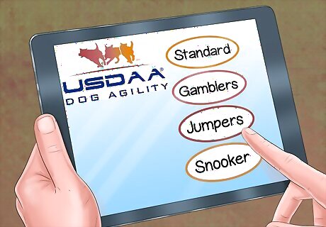 Choose your class. Classes are the different games, courses, and obstacles that are available for your dog to demonstrate their agility. Each class tests a different set of skills. AKC offers six classes: Standard, Jumpers With Weaves, and Fifteen And Send Time (FAST), Time to Beat (T2B), Premier Standard and Premier Jumpers With Weaves. NADAC offers six classes: Regular, Jumpers, Tunnelers, Weavers, Touch-N-Go, Chance, and Hoopers. USDAA offers four classes: Standard, Gamblers, Jumpers, and Snooker. CPE offers seven classes: Standard, Colors, Wildcard, Jackpot, Snooker, FullHouse, and Jumpers. Check each group’s website for a complete description of the various classes.