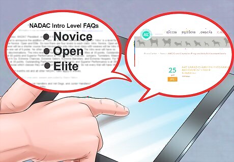 Choose your title level. Title level refers to whether your dog is a beginner or an experienced agility trailer. Most groups require you to start at the lowest level and earn qualifications for high levels. AKC has six title levels: ACT 1, ACT 2, Novice, Open, Excellent, and Master. NADAC has three levels: Novice, Open, and Elite. USDAA has three categories, each with their own levels. The categories are Championship, Performance, and Junior. CPE has six levels: Level 1, Level 2, Level 3, Level 4, Level 5, Level C. Check each group’s website for a description of the title levels.