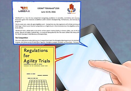 Learn the rules of the trial. Each agility trial has its own rules and regulations. These are typically posted online, though you might only receive specific guidelines for the agility trial you and your dog enter into when you officially register. AKC rules and regulations are available at http://images.akc.org/pdf/rulebooks/REAGIL.pdf. NADAC rules and regulations are available online. USDAA rules and regulations are posted online at http://usdaatitlemania.com/wp-content/uploads/2016/03/USDAA-TitleMania-Regs-Final-Revisions.pdf.