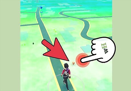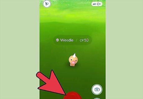Use the Pokéball in the bottom of your screen to catch the Pokémon. Using your thumb or forefinger, “throw” the ball toward the wild Pokémon you want to catch. Press the ball, move your finger toward the Pokémon, and release.