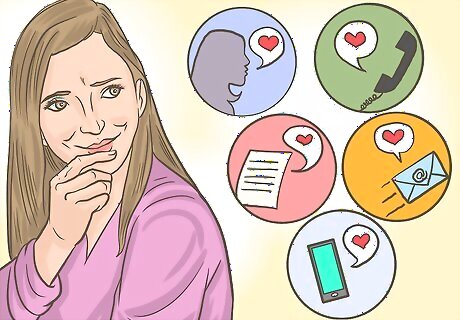Think about how you want to tell your crush about your feelings. Each person is unique, and you might feel more comfortable expressing your feelings in one way than in another. Take time to think about how you want to do so. Tell him in person, which allows you overcome your fear of expressing yourself in person and being vulnerable and also gives you the opportunity to see his reaction. This is the most authoritative method, because he will know that you are serious. Express your feelings in a letter or note, which might feel more comfortable for you than telling him in person because you can think through what you want to say and save yourself some embarrassment of others overhearing. Bring it up in a phone conversation, which allows you to talk the idea through without the pressure of being there in person. This way, no facial expressions or reactions or seen, and it stifles a bit of the awkwardness. Explain your feelings in an email, which is a very similar option to writing in that it allows you to think out what you want to say and put yourself out there without anyone else knowing. Let him know in a text message, but keep in mind that this will limit how much you can type in one text message (unless you both use iMessage on iPhones). You have the opportunity to plan out what to say and can avoid the pressure of a face-to-face conversation. This is also much more casual, but it runs the risk of him not taking you seriously.