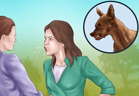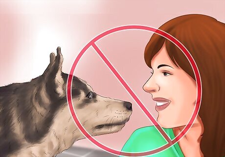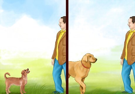 Avoid making eye contact. Staring directly at a dog can be seen as a challenge or a threat. Consequently, try to avoid making eye contact with the dog. Also, try not to stand facing the dog, but stand with your body sideways. Standing with your body sideways is less threatening, and will encourage the dog to want to meet you.