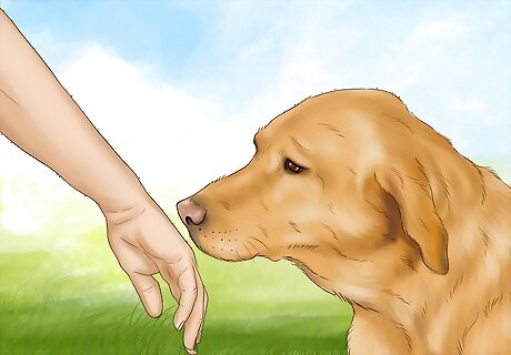 Let the dog approach you. Always let the dog approach you first. This will allow the dog time to adjust to having you in its space, and become more comfortable with you. If a dog is comfortable with you, you are more likely to be comfortable around the dog. If a dog is shy, but still approaches you, do not talk to the dog or make eye contact with it. Let your hand hang by your side so the dog can sniff it.
