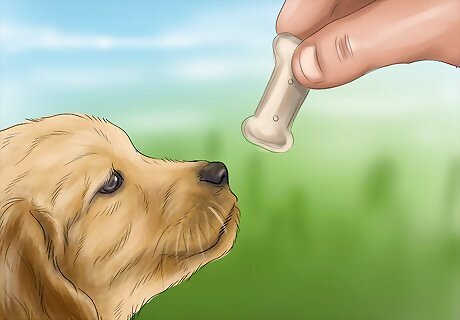Give the dog a treat. Treats are always a great way to get a dog to like you, and thus, be comfortable around you. This way, you will also be comfortable around the dog. When giving a dog a treat, do not dangle the treat in the air. This can cause the dog to stand on its hind legs or jump up to retrieve the treat. They have less control over the mouths when jumping up to retrieve a treat. Instead, place the treat in the palm of your hand. Make sure your palm is flat. Then, bring the treat close to the dog’s face, i.e., under its mouth or at chest level. Let the dog lick the treat from your hand.