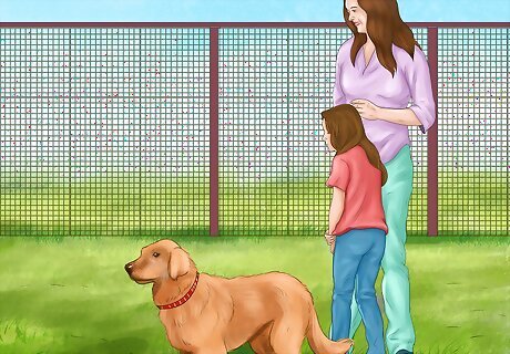 Visit a dog park. With a friend or a family member, visit a nearby dog park. You do not need to go inside the dog park. Instead, you can stand outside of the park. Watch how the dogs interact with each other and the people. Particularly, watch the larger dogs. Observe how their interactions aren't any different than the interactions medium and small dogs have. Bring some dog treats with you. Try giving a large dog a treat through the fence if their owner allows. You can also have your friend give the dog the treat. Watch how the dog interacts with your friend. Then, try to give the dog a treat.